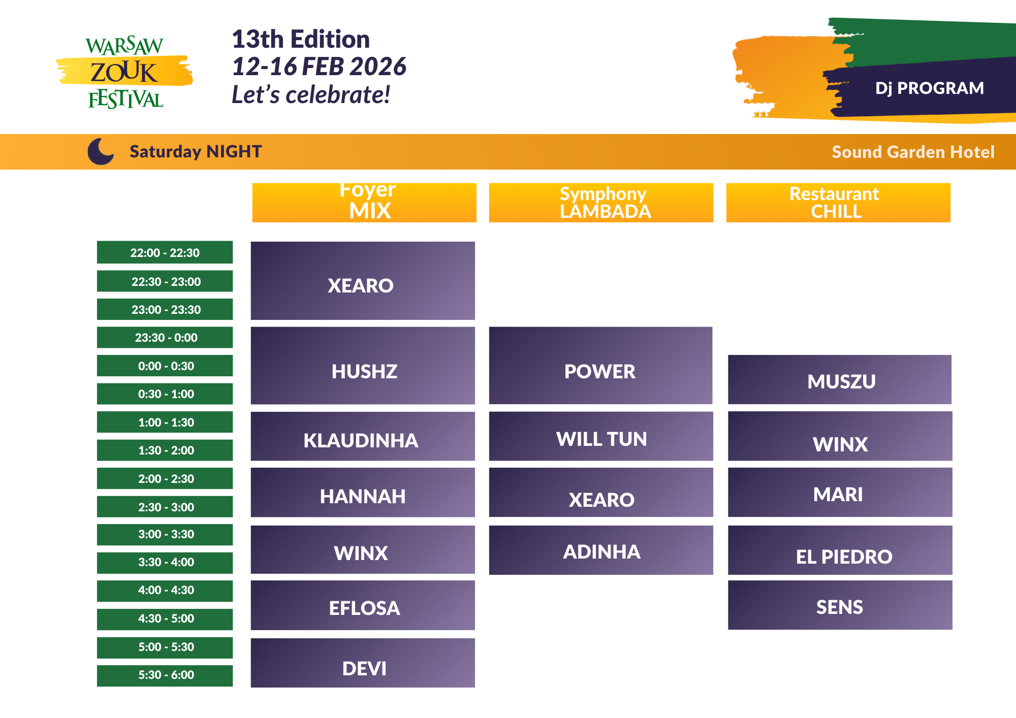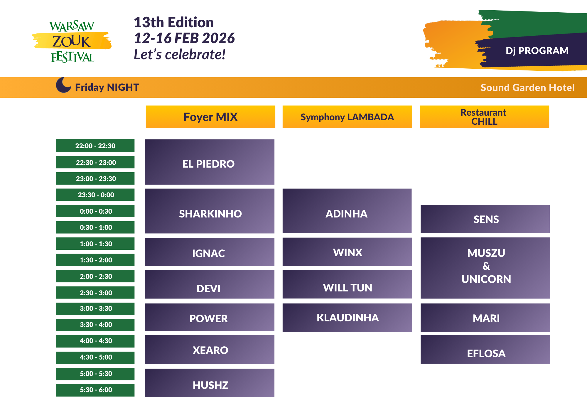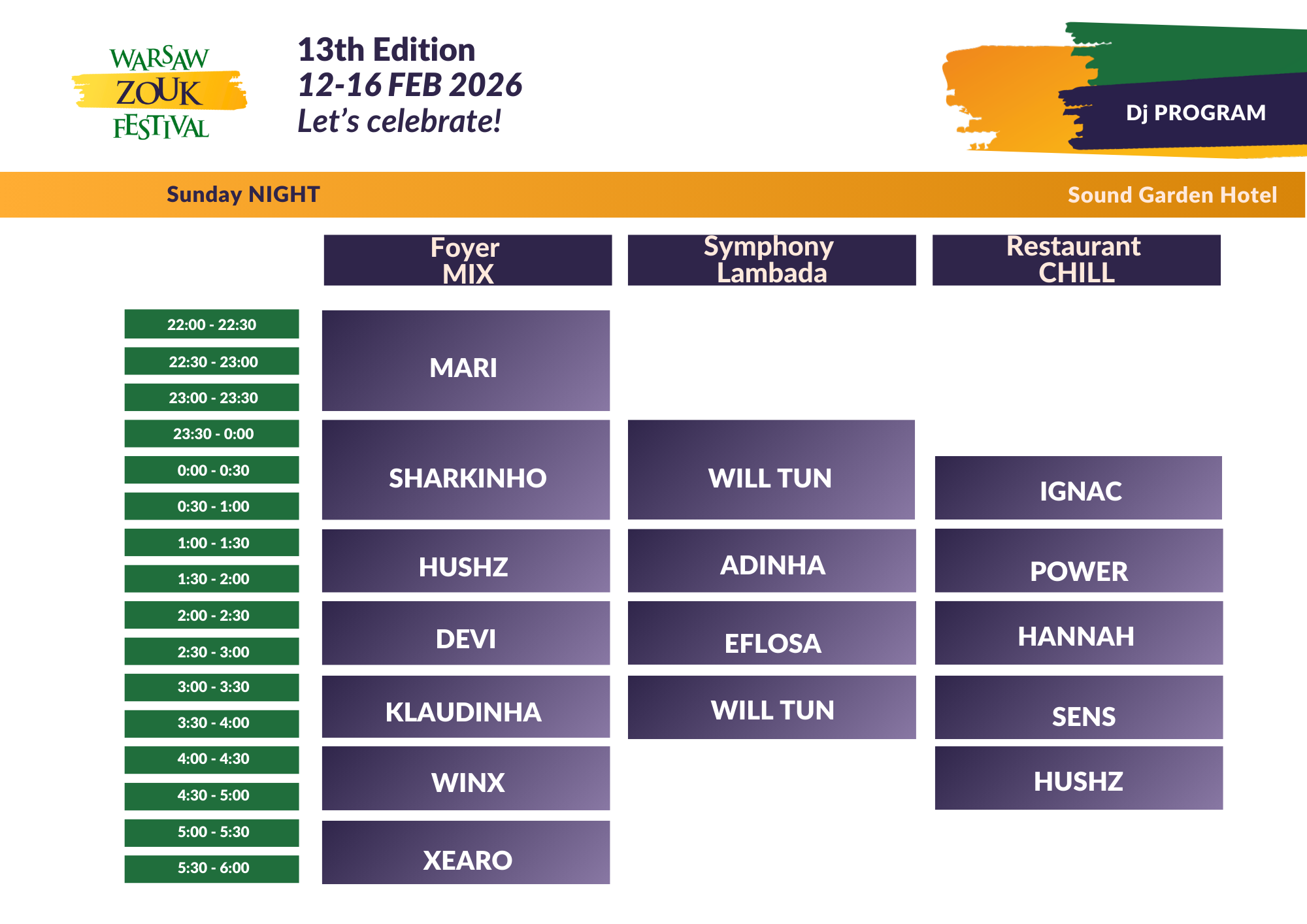 🪩 Bilet obejmuje wszystkie festiwalowe imprezy: maraton dzienny + imprezy nocne od czwartku wieczorem do poniedziałku rano (do 6:00).